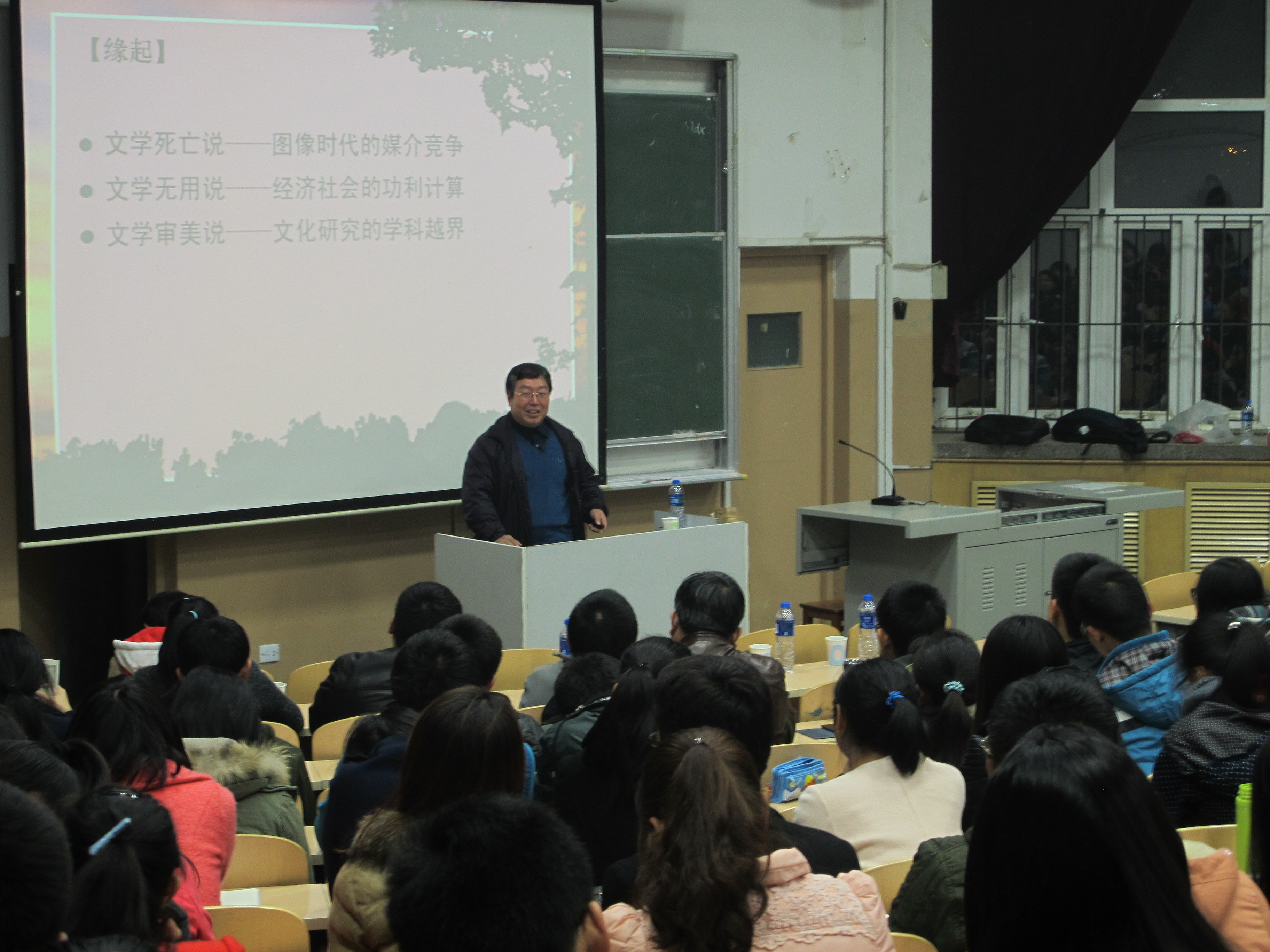 “文学是‘死’了吗?在我看来,文学并没有‘死’,”沈立岩教授开场时讲道,“现在这个图像时代,寄身于文字和纸张的文学却已经大为萎缩,似乎文学已经远离了我们,其实不然,因为作为文学核心特质的文学性现今依旧大行其道。”沈立岩教授从我国古代文学经典作品《诗经》入手,以自然灾害这一独特的视角切入,深入浅出地为同学们讲解了自然灾害在文学作品中的体现以及自然灾害对社会政治的影响。沈立岩教授指出文学作品不仅具有审美价值,同时还对我们了解世界有着重要的认知作用。“诚然‘文学不烤面包’,可人不应生来只吃面包,人还应有精神生活,而文学就可以提供这样的精神生活。”随后,他以春秋时期各国外交事件为例,说明了“不学诗,无以言”。