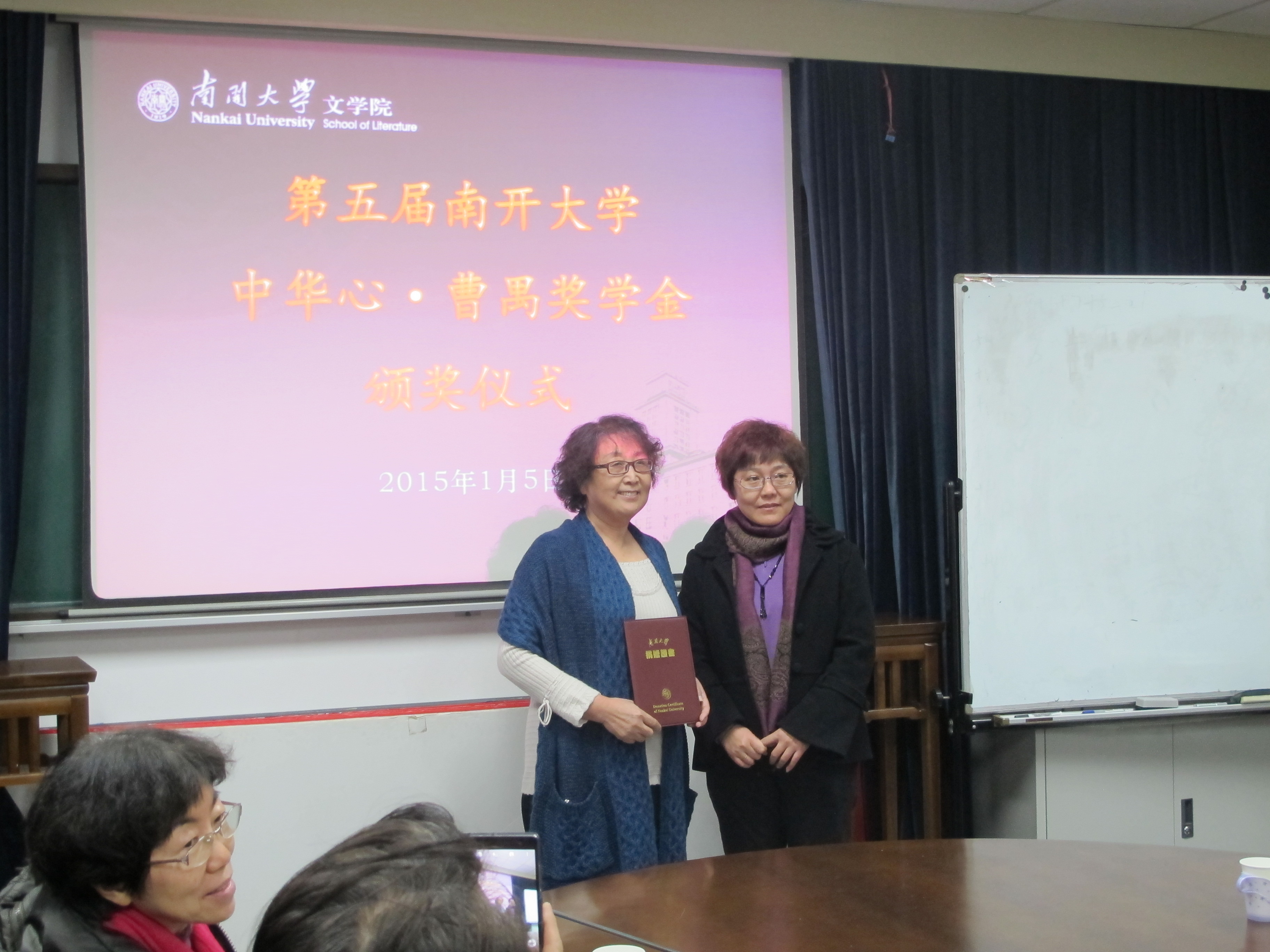 中文系主任乔以钢介绍了“中华心·曹禺奖学金”及此次评审情况,并宣布获奖名单。本年度“中华心•曹禺奖学金”申报评审工作于2014年11月初启动,向全校22个专业学院以及活跃在南开园内的员工剧社发布了评选通知。经过初评、复评和终评三轮评审,确定了获奖名单。