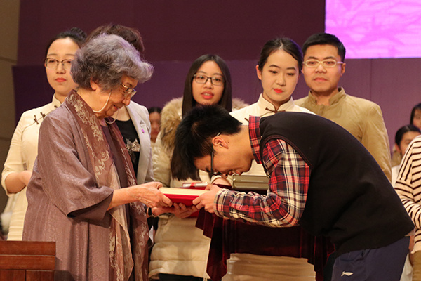 叶嘉莹、杨克欣为获奖员工颁奖。杨佳将作为获奖代表在发言中感叹道:“古典文化不惟是一种外在的宝贵遗产,它更是植根于每一个人心里的、一代代传承下来的精神。人能弘道,非道弘人,叶先生对后学者循循善诱,寄以厚望,在南开园中种下诗词的种子,她的精神有如夜里的长明灯,给我们的温暖是恒久的、永存的。”
