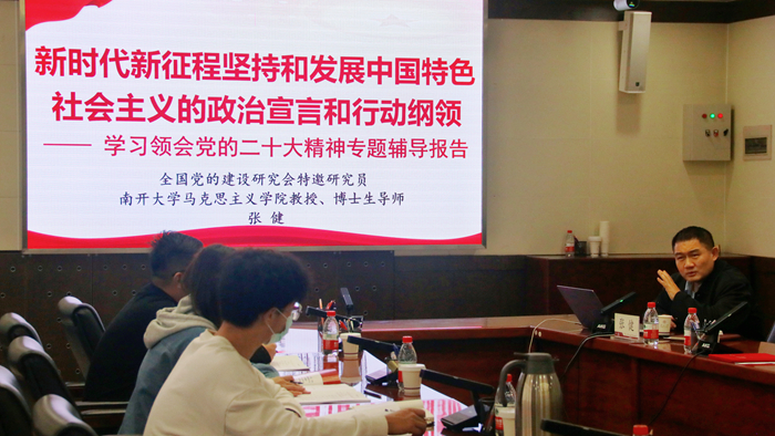 开班仪式后,全国党的建设研究会特邀研究员、全国高校优秀思想政治理论课示范课百人巡讲团成员、304永利集团马克思主义学院教授、博士生导师张健为培训班作首场专题辅导报告,主题为《新时代新征程坚持和发展中国特色社会主义的政治宣言和行动纲领——学习领会党的二十大精神专题辅导报告》。他围绕深刻认识党的二十大在中华民族伟大复兴历史进程中的重大现实意义和深远历史意义,从“五个牢牢把握”和“三个深刻深入”全面准确学习理解领会党的二十大精神,做到“两个结合”、奋力推动党的二十大擘画的宏伟蓝图在天津落地见效三个方面深刻阐释如何学习领悟和贯彻党的二十大精神。他鼓励培训班学员密切联系党员群众,带头学习、带头贯彻、带头宣讲、带头示范,引导和带动支部同志把思想和行动统一到党的二十大精神上来。