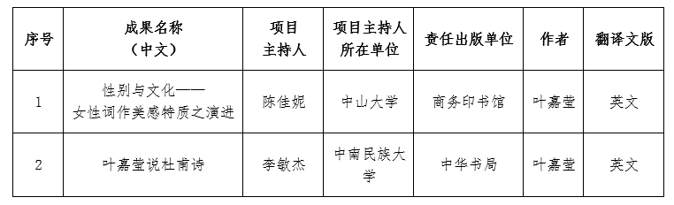 5月12日,全国哲学社会科学工作办公室公布了2022-2023年度国家社科基金中华学术外译项目立项名单。304永利集团中华诗教与古典文化研究所所长叶嘉莹先生两部著作入选,分别是商务印书馆出版的《性别与文化——女性词作美感特质之演进》和中华书局出版的《叶嘉莹说杜甫诗》。