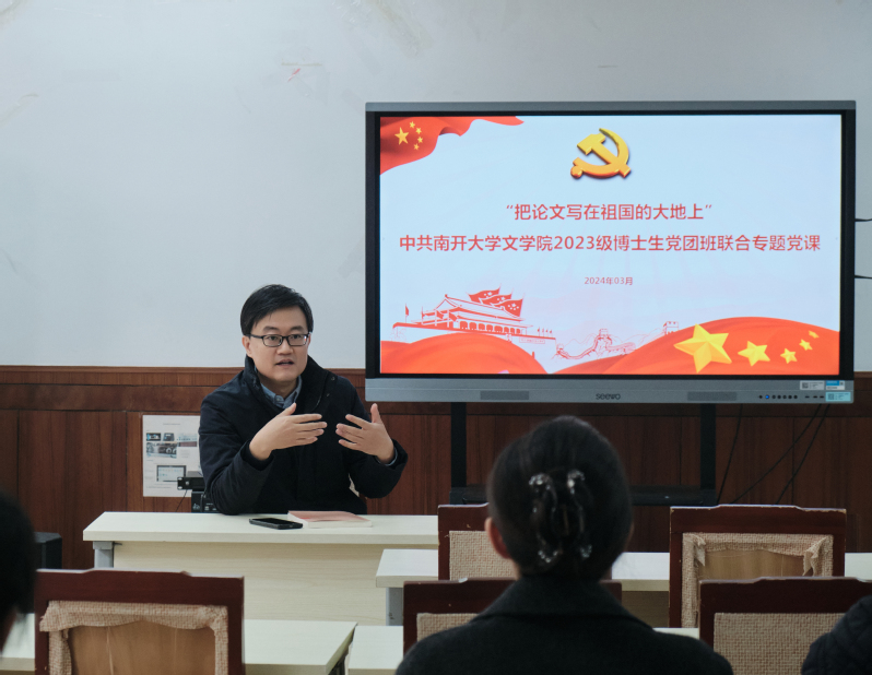 本次党课积极响应习近平总书记2020年在经济社会领域专家座谈会上的号召,以“把论文写在祖国大地上”为主题,从教师领学、师生共研、传道授业三个方面展开学习。卢桢教授首先带领同学们再次回顾并深入研读了《党史学习教育工作条例》《中国共产党巡视工作条例》,学习习近平总书记视察天津重要讲话精神、全国教育工作会议精神。在师生共研环节,卢桢教授强调,在现代化时代潮流面前,文学研究者首选要有宏观意识,积极主动将个人志趣与国家文化建设需要相结合,自觉思考如何“把论文写在祖国大地上”,了解文学研究的主流方向及热点,寻找中国式现代化与中国话语研究的契合点,构建中国视野,讲述中国故事,做好中西对话与转化,激活本土文化;其次,文学研究者要从细处入手,小处着眼,建立问题意识,脚踏实地做研究。卢桢教授将“把论文写在祖国大地上”的宏大主题与博士生的社会实践相结合,根据同学们日常学习生活中遇到的论文选题及撰写、开题资格考试、科研工作及时间安排、出国深造等方面的问题,结合自身求学问道的切身经历,进行一一解答。