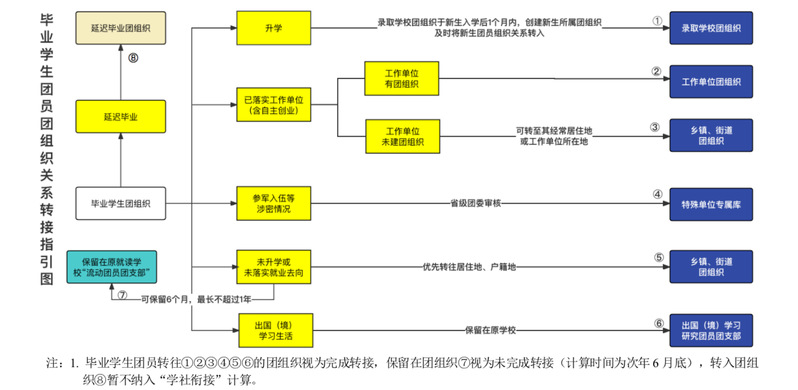 未升学或未落实就业去向的团员组织关系优先转至经常居住地所在的乡镇、街道团组织,也可转至户籍所在的乡镇、街道团组织。原就读学校可保留团员组织关系6个月,最长不超过1年,符合条件应及时转出。已毕业未及时转出团关系的流动团员,须按要求参加组织生活会(包括但不限于三会一课、青年大学习等),按要求缴纳团费。