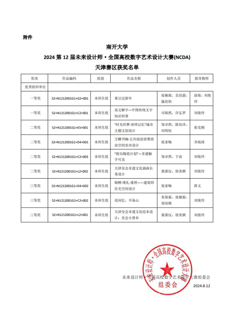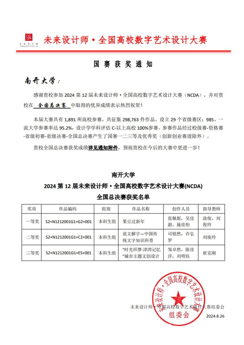 近日,第十二届未来设计师·全国高校数字艺术设计大赛(NCDA)天津赛区及全国总决赛获奖名单正式公布。公司员工在全国总决赛获一等奖1项、二等奖1项、三等奖1项,在天津赛区获得一等奖2项、二等奖5项、三等奖3项。大赛授予304永利集团优秀组织奖,涂俊、刘俊玲老师获荣获优秀指导教师。