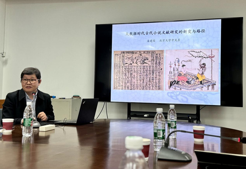 潘建国的讲座题目是《大数据时代古代小说文献研究的新变与路径》。他结合自身研究,讨论大数据时代下小说文献研究是否还能做,应该怎么做以及有何新变等命题。讲座围绕三句话展开。第一句话是“满世界寻找古小说”。“满世界”包括实体世界与网络世界。近年来,“寻找古小说”的重心应从未见书转向已见书,通过行走与目验,努力将枯燥的文献调查研究,转化为生动新奇的人生体验。第二句话是“于精微处见学术”。通过系列生动的学术个案,强调小说文献研究应从书叶细节入手,挖掘其背后的独特意义;从文本细部着手,借助比勘,寻找特异文字,确立版本标记物,以此筛检新文献的版本身份;以史为径,对小说文献进行学术赋值。第三句话是“以理论照亮文献”。潘建国指出,真正具有学术生命力的理论(术语),乃从原始文献材料中精心提炼而出,又能照亮文献的潜在意义,并引领其提升到一个更高广的学术境地。