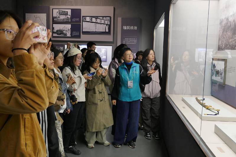 展览分为“奋起救亡”“津门浩劫”“市区抗战”“盘山烽火”“赢得胜利”“抗战英烈”六个部分,390幅图片、144件文物、23件档案资料,静默无言,却共同勾勒出一幅血火交织的历史长卷。从天津租界地图到《益世报》资料,从《塘沽协定》图片到战场钢刀文物,抗战的艰苦与中华民族的坚韧在无声中展现。同学们久久驻足,仰慕与痛惜在目光中交织,英雄的可敬与鲜活从未如此可感可知。