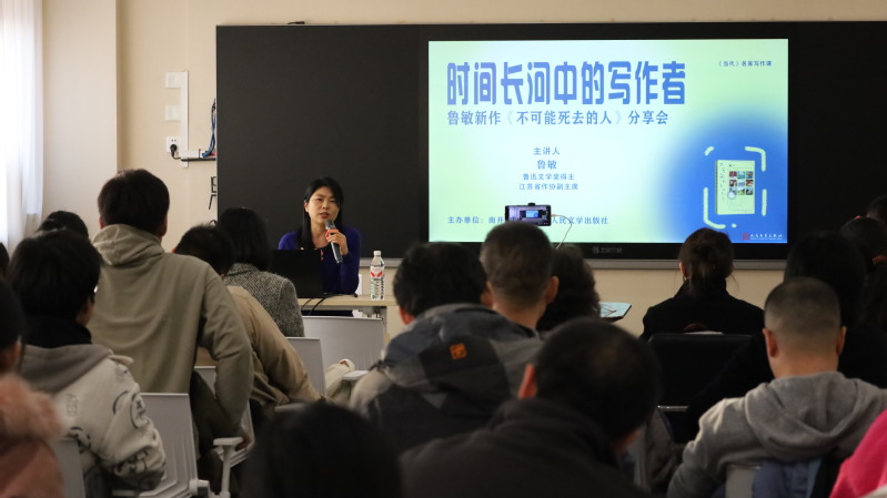 鲁敏在讲座中提出:“我们写作的人和所有从事各种职业的人一样,都处在时间和空间当中。写作的人后面有两只手,一只是空间,一只是时间。”她结合自己的创作经历,阐述了时间和空间在文学创作中的重要作用。
