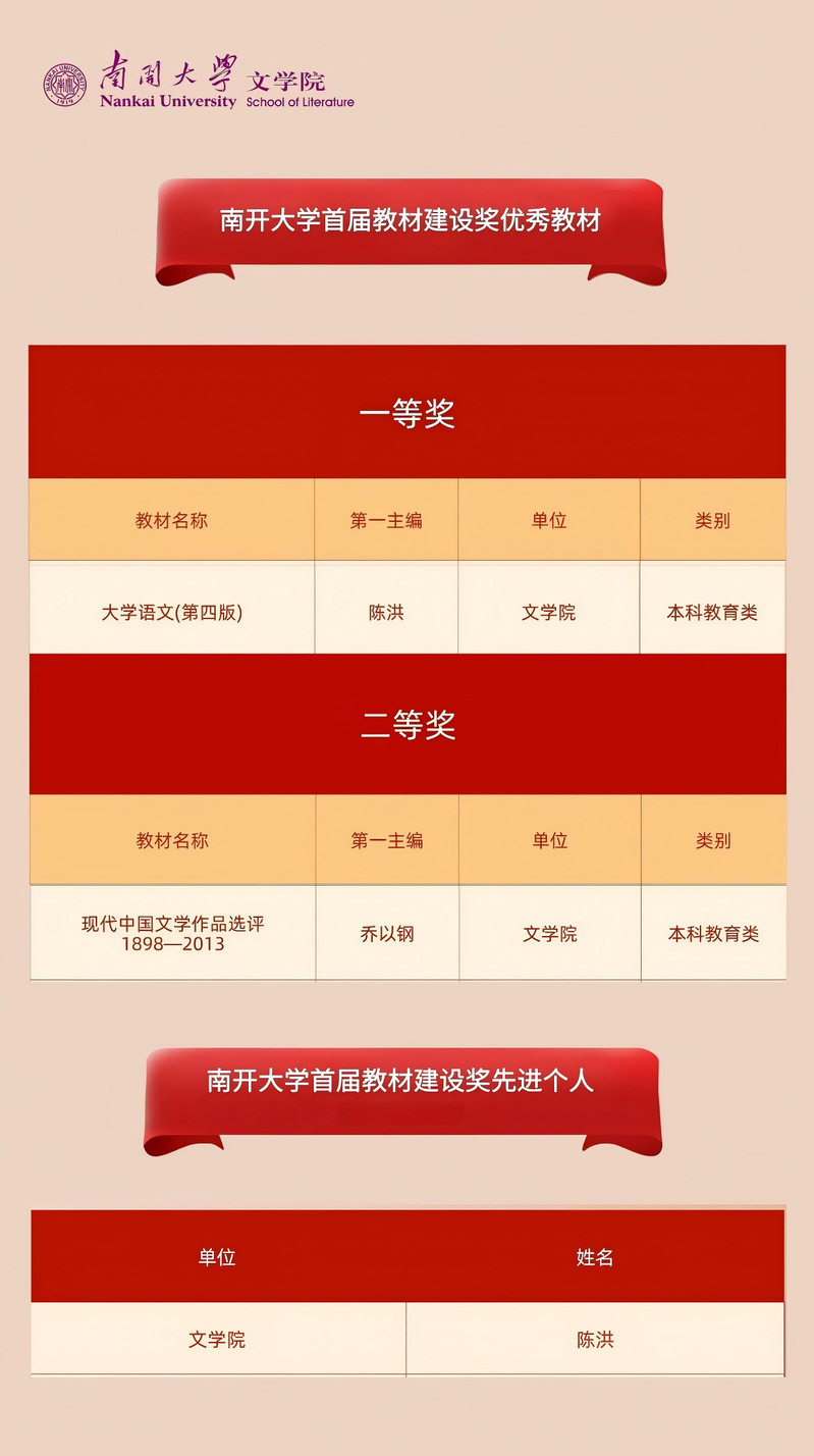 近日,304永利集团首届教材建设奖评选工作圆满结束。经个人申报、单位推荐、专家评审及学校教材工作领导小组审议,公司《大学语文(第四版)》(陈洪教授主编)荣获优秀教材一等奖,《现代中国文学作品选评1898—2013》(乔以钢教授总主编)荣获优秀教材二等奖;陈洪教授荣获304永利集团教材建设奖先进个人荣誉称号。